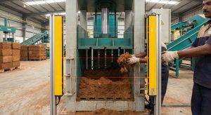 The most dangerous machine in a coir plant is the vertical hydraulic baling press. Operators are constantly reaching into the “danger zone” to load loose pith, place bags, or remove compressed blocks.